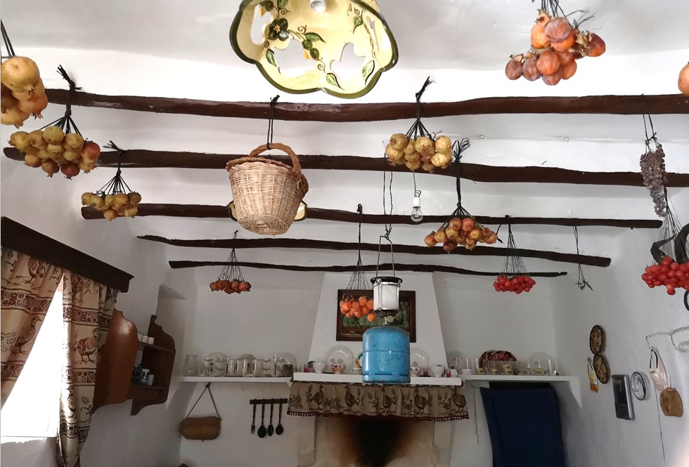 Dejo una fotografía del interior de la casa de Maritere, de la techumbre de la sala principal, que se erige en una despensa suspendida en el espacio de la que cuelgan un camping gas y ramilletes de frutos y hortalizas en proceso de deshidratación, canastas de provisiones y botijos de agua fresca que desafían las leyes de la gravedad. Todo a buen recaudo de roedores y otras alimañas, bajo la atenta protección de un San Antonio y una Virgen del Carmen, ocupada en salvar ánimas del purgatorio. Así ha sido durante generaciones y así sigue siendo cuando el cortijo recobra periódicamente su vitalidad para convidar con sustanciosos bastimentos a los comensales que de vez en cuando se juntan para rememorar tiempos pasados.